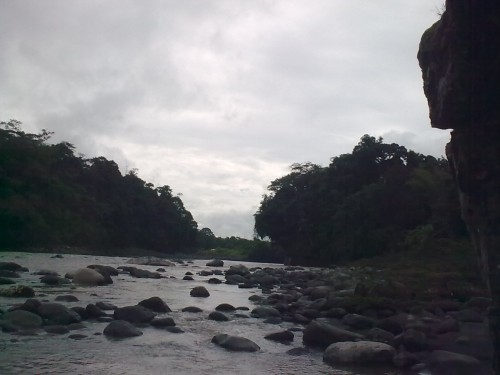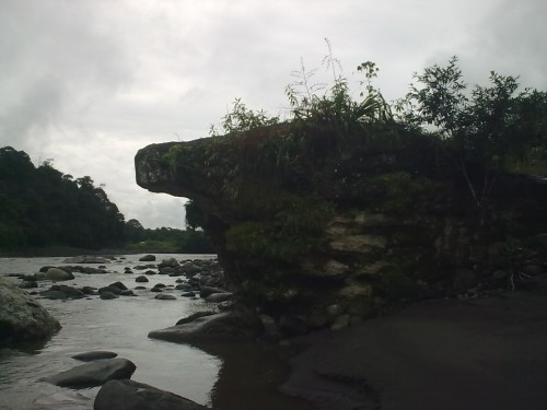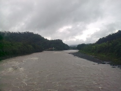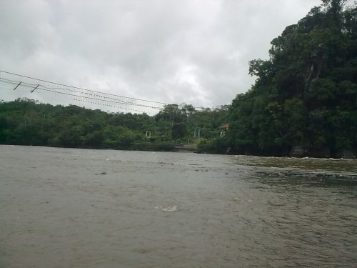 Vista desde el antiguo puente colgante, por donde se transitaba hacia la ciudad de Macas, unos kilómetros más abajo se encuentra el nuevo puente, por este lugar se pasaba en cano y luego en gabarra, por el peligro se dejó y se construyó el nuevo puente, al otro lado se encuentra el rio Chiguaza que tiene un puente pequeño, en esta parte se une el Chiguaza con el Pastaza.