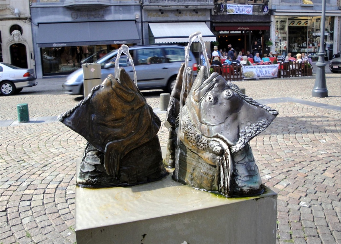 Fuente con formas de cabezas de pescado en la Plaza Ijzerenleen, pues aquí se ubicaba el principal mercado de pescado de la ciudad.