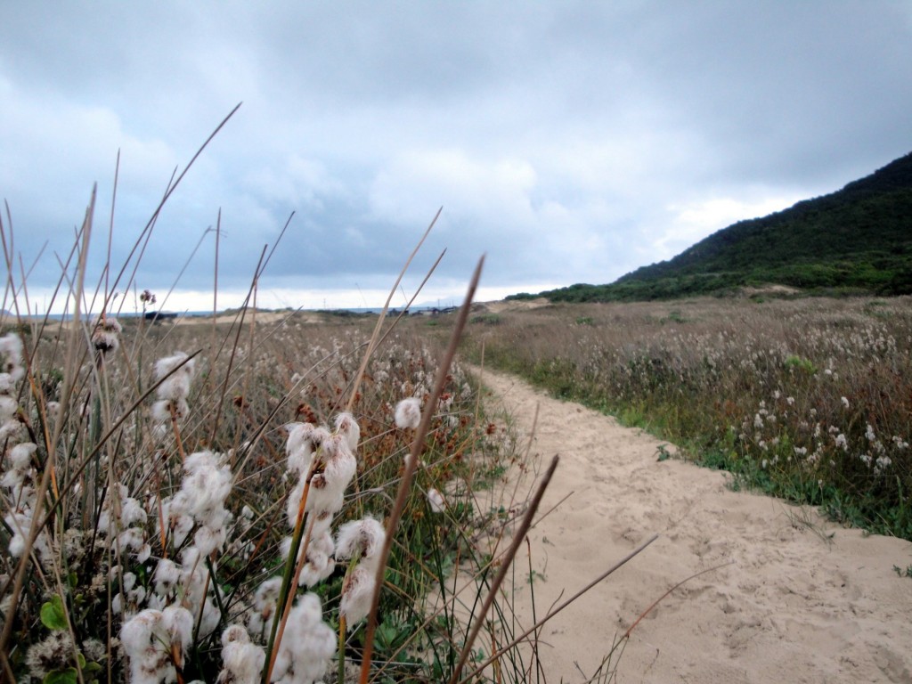Camino a través de vegetación y dunas de arena, entre "Praia do Santinho" y "Praia dos Ingleses".