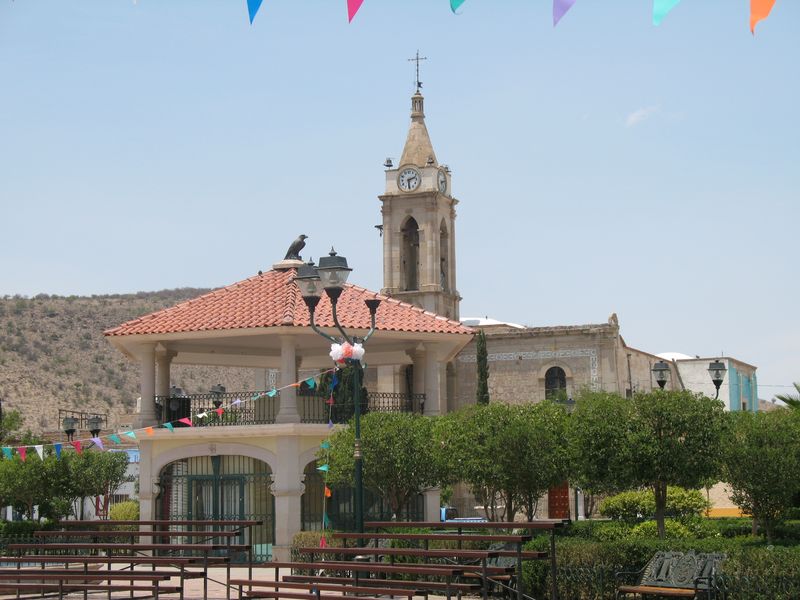 Iglesia de San Diego de Alcala y kiosco en Canatlan