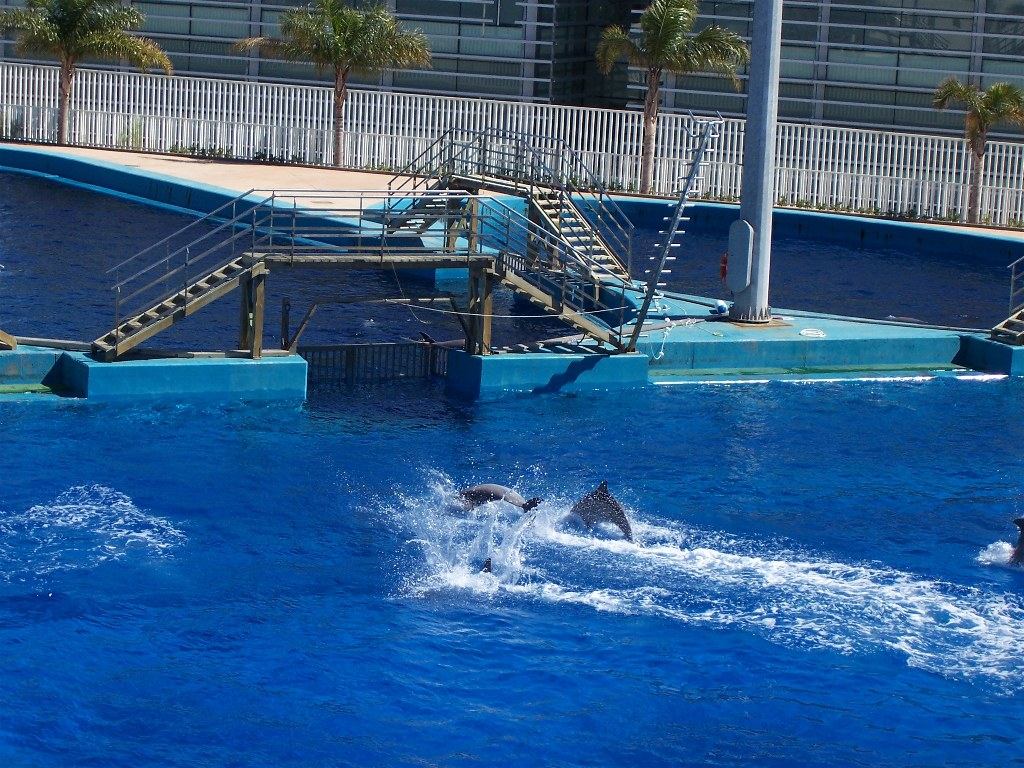El delfinario consiste en una piscina gigantesca que está rodeada de gradas en las que caben más de 2.000 personas. Dentro de esta piscina se realizan diversos espectáculos en los que los principales protegonistas son los delfines, unos animales que a mí me parecieron mucho más grandes de lo que me imaginaba, ya que miden más de 4 metros. Los espectáculos que realizan son fantásticos.