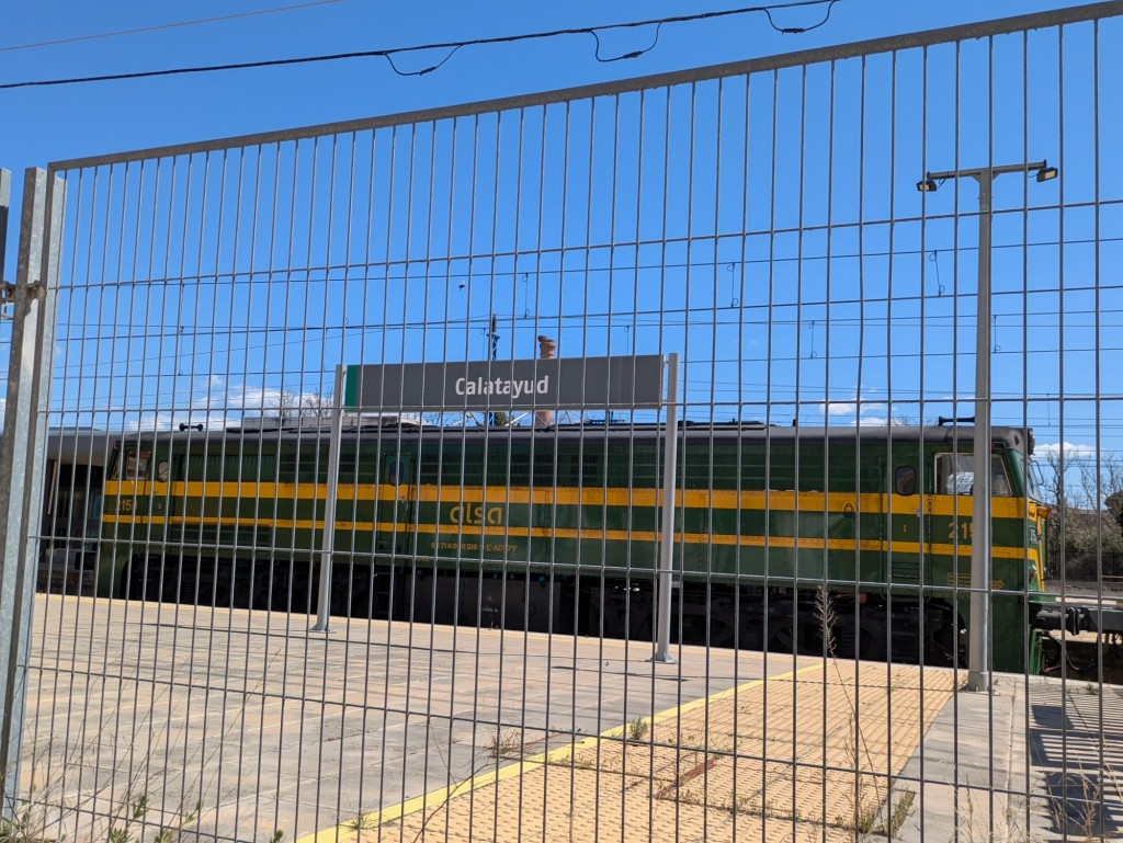 Locomotora 2150 de Alsa Rail a la cabeza de vagones de carga. Estamos acostumbrados a ver esta maquina remolcando trenes turísticos; ahora se esta utilizando para los trabajos de la autopista ferroviaria Zaragoza-Algeciras