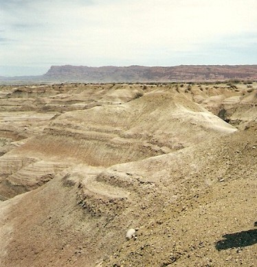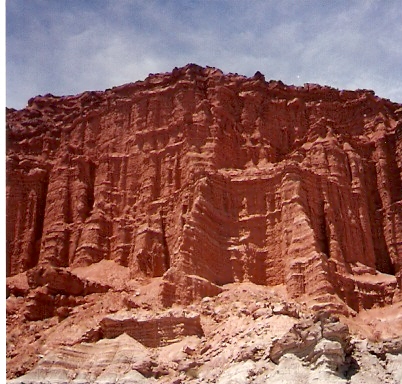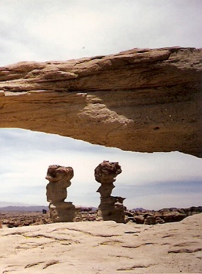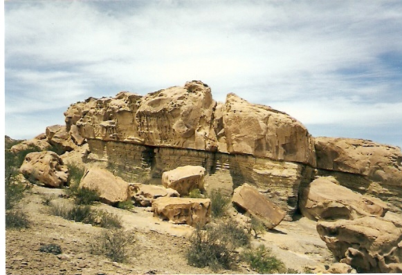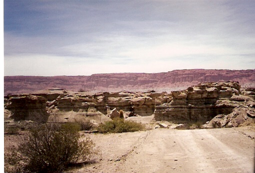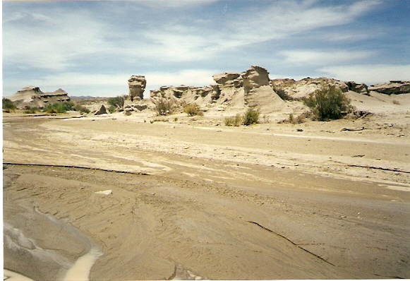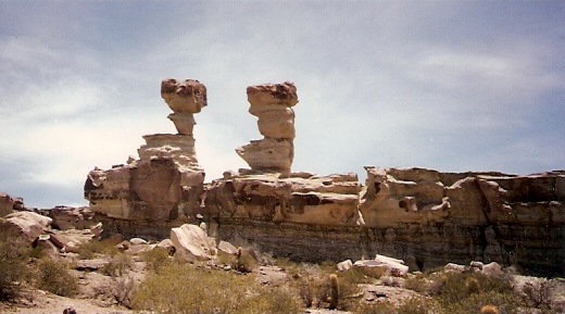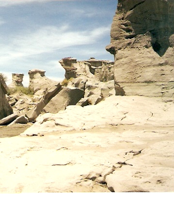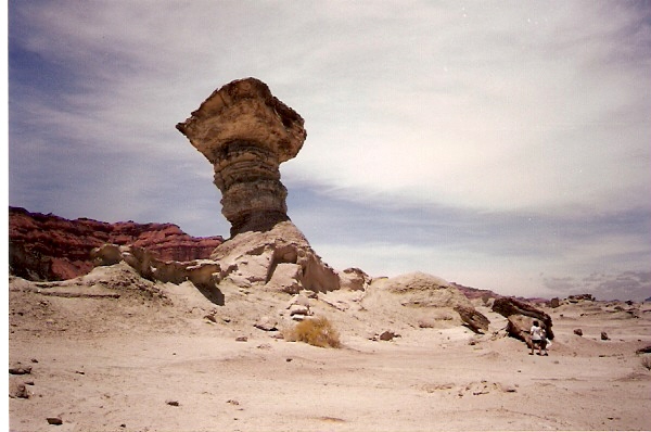 Las rocas de Ischigualasto al ser erosionadas de diferente manera crearon formas sorprendentes como la Cancha de Bochas, el Submarino, el Hongo y otras. En esta foto se muestra El Submarino, correspondiente al período triásico medio.