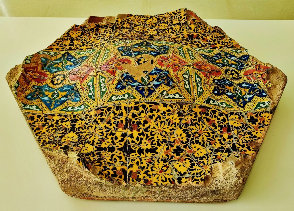 Pieza de "trencadís" (tipo de aplicación ornamental del mosaico a partir de fragmentos cerámicos —básicamente azulejos— unidos con argamasa) utilizado por Gaudí para el Parc Güell hacia 1.903, expuesto en la Sala Modernista del Museo (2).