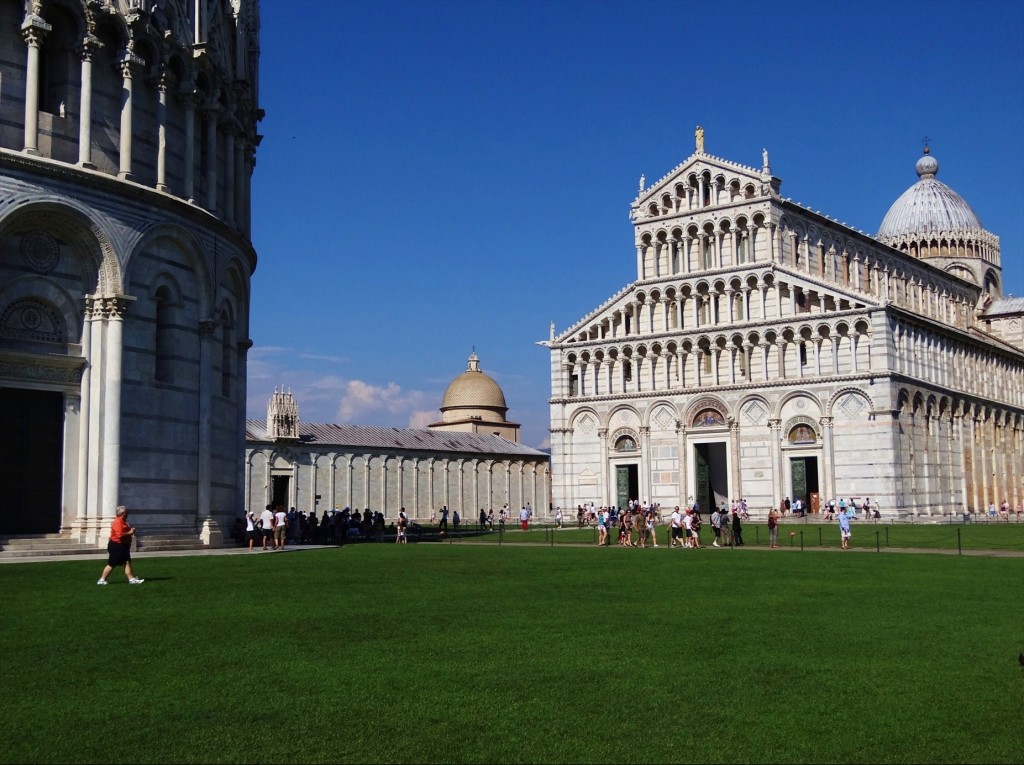 A la izquierda, vista parcial del "Battistero di San Giovanni" y al fondo, del "Campo Santo Municipale" con su cúpula rutilante; a la derecha, vista frontal del "Duomo", en la "Piazza dei Miracoli".