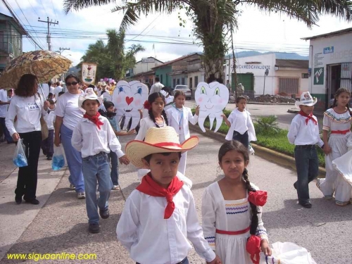Grupo de niños y niñas de Escuelas Primarias desfilan en trajes tipicos, celebrando la semana de la higiene bucal y de la lucha anticaries, en la Avenida Francisco Morazán.