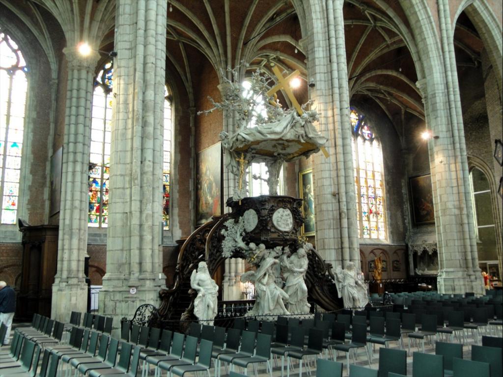 El púlpito barroco de la Nave Central, en el interior de la Catedral de San Bavón. Fue realizado en mármol blanco y madera, en 1.745.