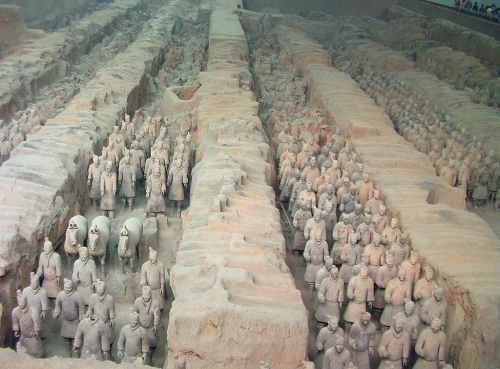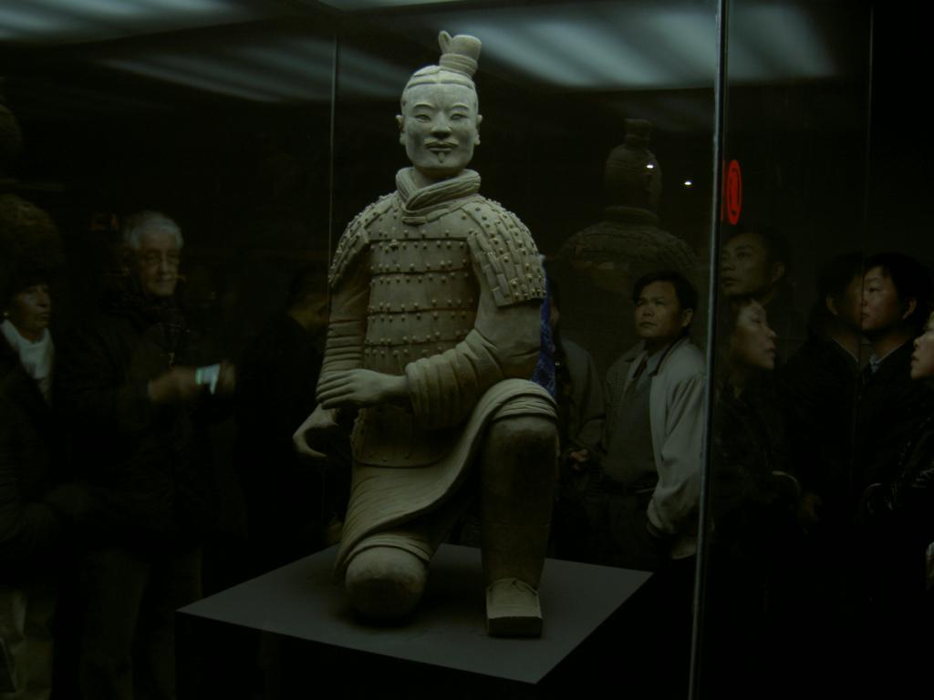 Imponente guerrero de terracota que se expone junto a otras piezas en un apartado dentro del cetro de visitas de los guerreros de terracota de Xian.