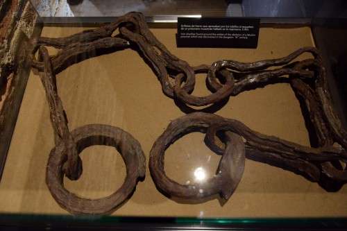 Foto: Grilletes de hierro que apresaban los tobillos de un esqueleta musulmán hallado en la mazmorra S.XVI - Almuñecar, España